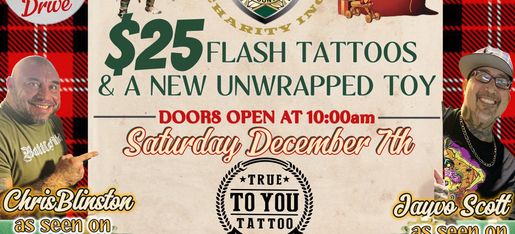 Stop by Saturday December 7th & bring a new unwrapped toy, and $25 and you'll get to choose your tattoo design!
